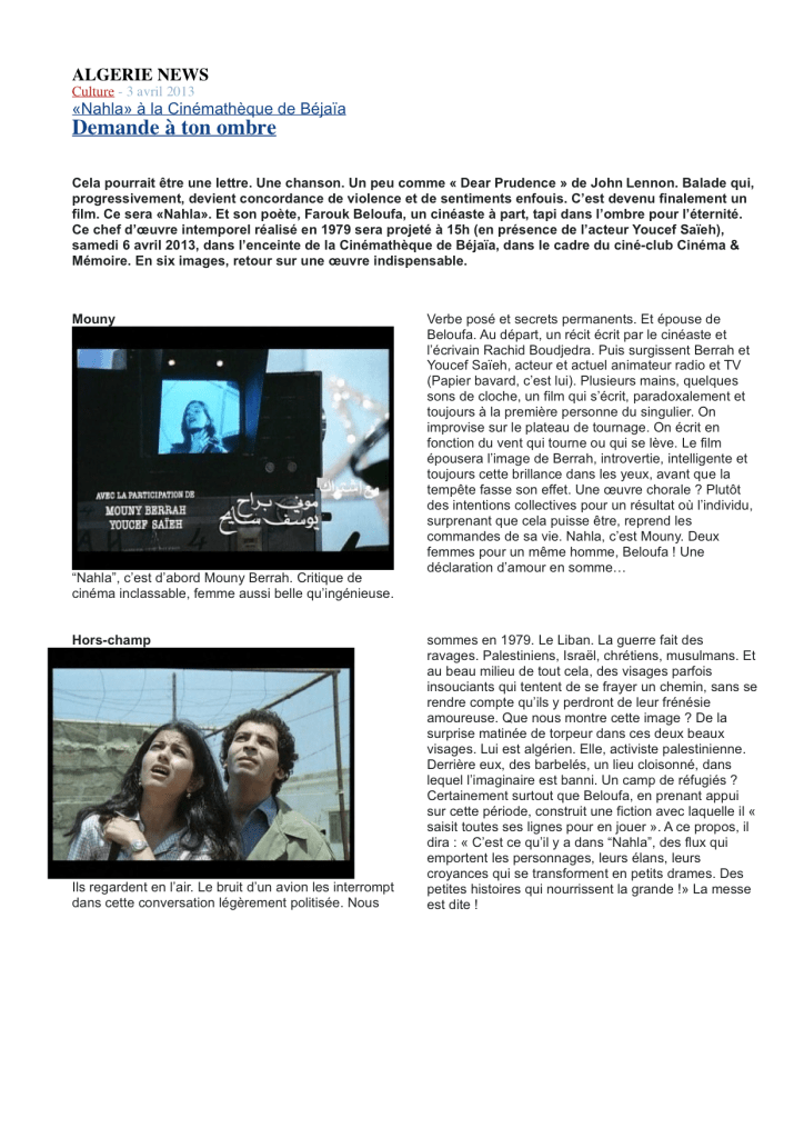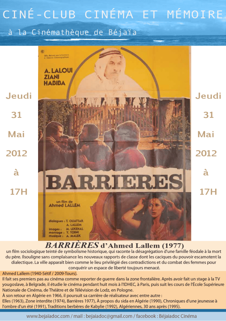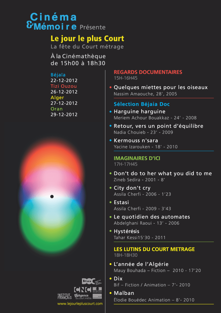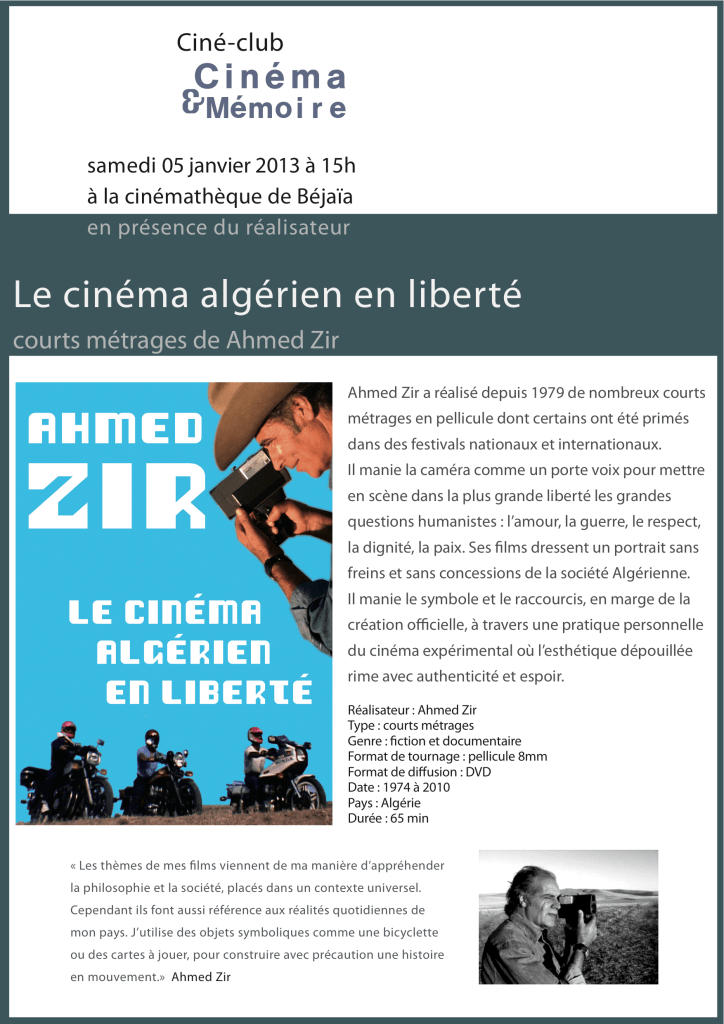 En 2011, j’ai été recrutée au sein de l’association Cinéma & Mémoire comme chargée de diffusion. Dans le cadre de ce poste, j’organisais des séances publiques de projections des films des ateliers de réalisation documentaire Béjaïa Doc au sein de différentes structures dans toute l’Algérie (cinémathèques, maisons de jeunes, ciné-clubs associatifs, clubs étudiants, etc) et j’animais un ciné-club mensuel sur le cinéma algérien à la cinémathèque de Béjaïa.